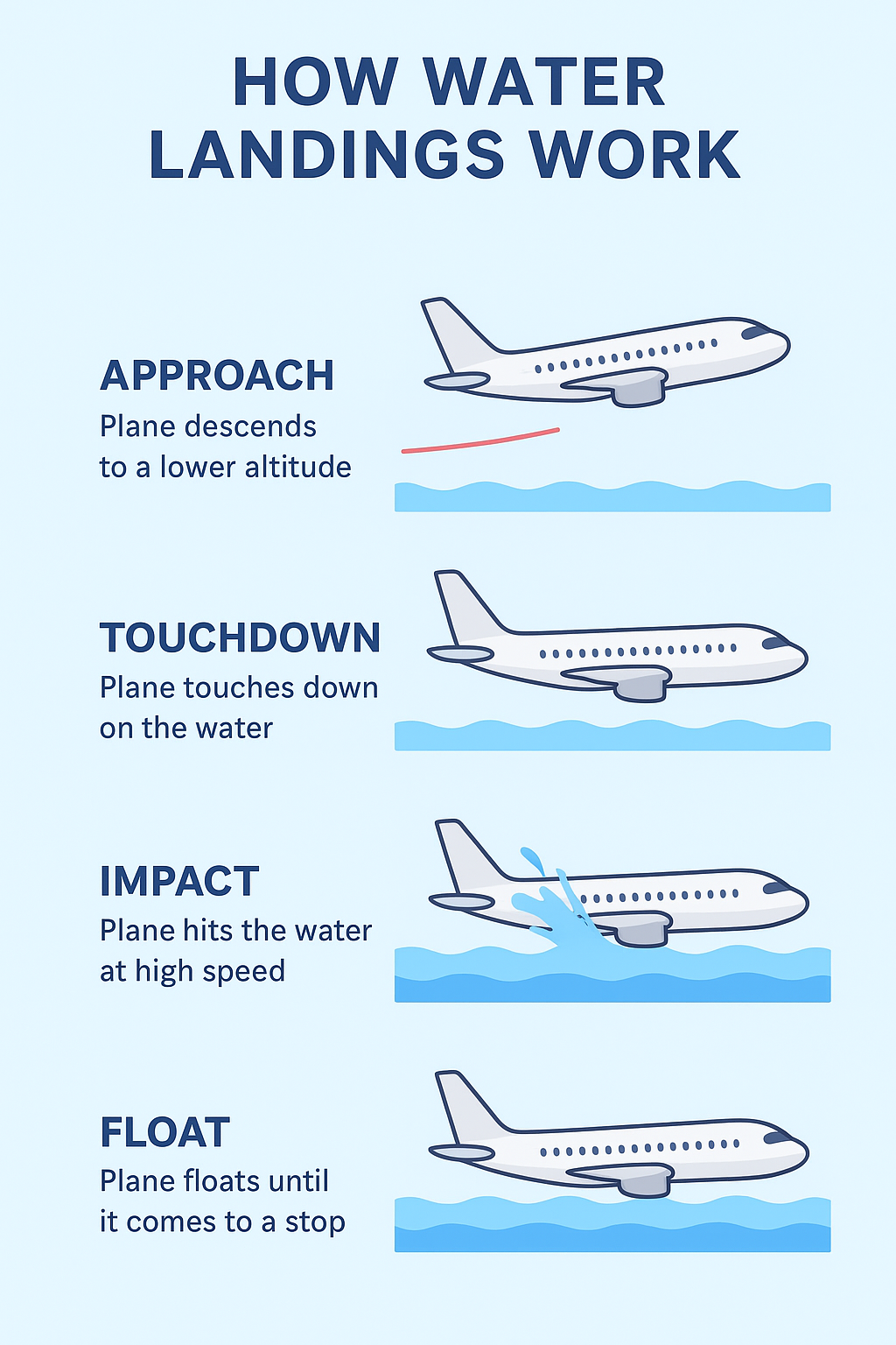 The pilot also calculates fuel levels, height above the water, and airspeed to ensure a safe landing. Commercial airliners follow strict aviation safety procedures, including turning off engines, sealing the fuselage, and having flight crews ready with life rafts and survival equipment.